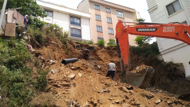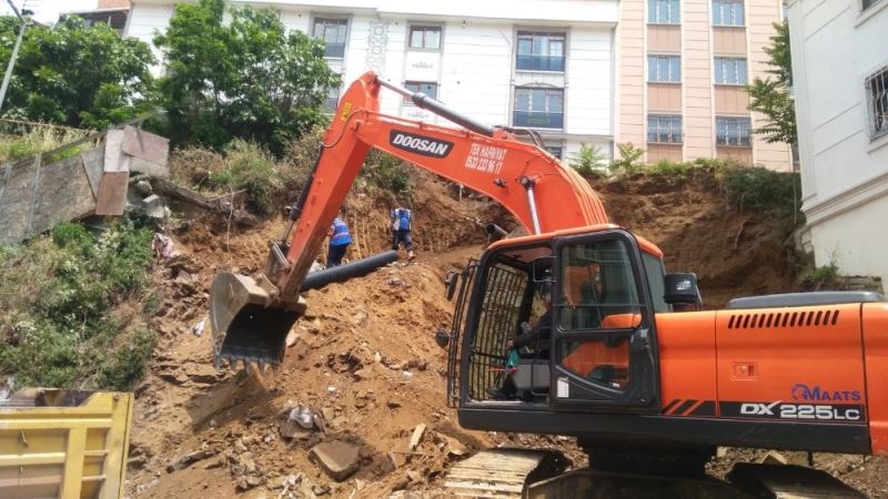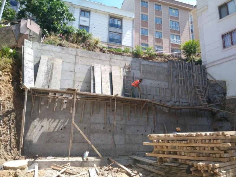 İslambey Şakayık Sokak’ta aşırı yağışlarda heyelan riskini önlemek amacıyla daha önce hafriyatı alınan alanda, perde duvar imalatına devam ediyor.