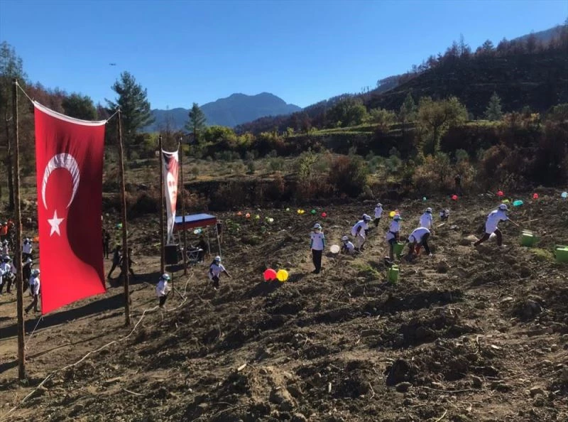 Burdur'un Bucak ilçesinde 11 Ağustos'ta çıkan, 21 evin zarar gördüğü ve 7 mahallenin tahliye edildiği orman yangınından etkilenen Çobanpınar köyü Karaağaç mevkisinde gerçekleştirilen törende ise 3 bin kızılçam, bin servi ve bin incir fidanı ile 100 kilogram kızılçam tohumu toprakla buluştu.