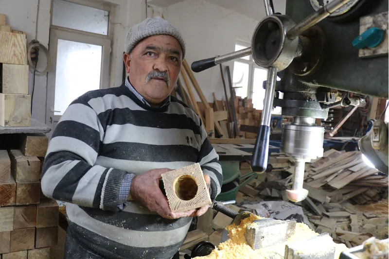 Asıl mesleğinin inşaat ustalığı olduğunu belirten Kurt, "İnşaatın kaba işlerinde çalışıyordum. Zamanla kendi ihtiyaçlarımız doğrultusunda keser sapı yapmaya başladım. Ardından talepler doğrultusunda üretimimi geliştirdim. Bardak, sehpa gibi ürünler yaparak adım adım ilerledim." dedi.