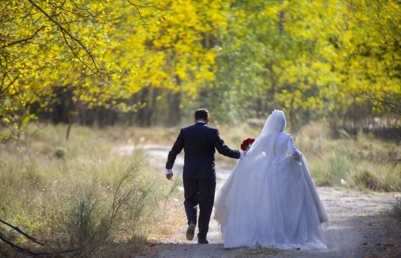 Sonbaharin gelmesiyle tabiat parkinda doganin tüm renklerinin görüldügünü belirten Yumsak, "Bu renkler gelinlik ve damatlikla bulustugunda ortaya çok güzel fotograflar çikti." diye konustu.