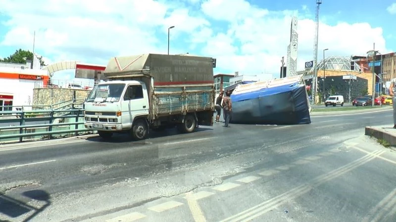 İstanbul’da ilginç kaza: Hasır yüklü kamyonun kasası yan yattı