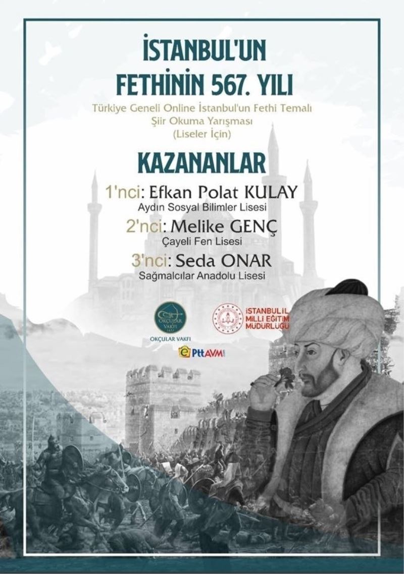 “İstanbul’un Fethi” temalı ikinci yarışma ise Cumhurbaşkanlığı himayelerinde Okçular Vakfı tarafından online olarak düzenlenen şiir okuma yarışmasıydı. Bu yarışmada Aydın Sosyal Bilimler Lisesi öğrencisi Efkan Polat Kalay, Arif Nihat Asya’nın “Fetih Marşı” şiirini okuyarak Türkiye 1.’si oldu.