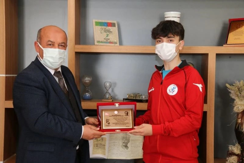 Başarısından dolayı Mehmet Eren Erdoğmuş’u tebrik eden Müdür Hasan Başyiğit, başarılarının devamını diledi.
