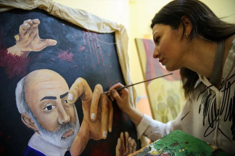 "O zaman vecd ile bin secde eder varsa taşım" dizesini resmeden Nevra Yaldız da İstiklal Marşı'nın ruhunu en güzel şekilde yansıtmaya çalıştığı eserinde, mısranın anlamlarını içeren bayrak ve caminin önemine vurgu yaptığını aktardı.