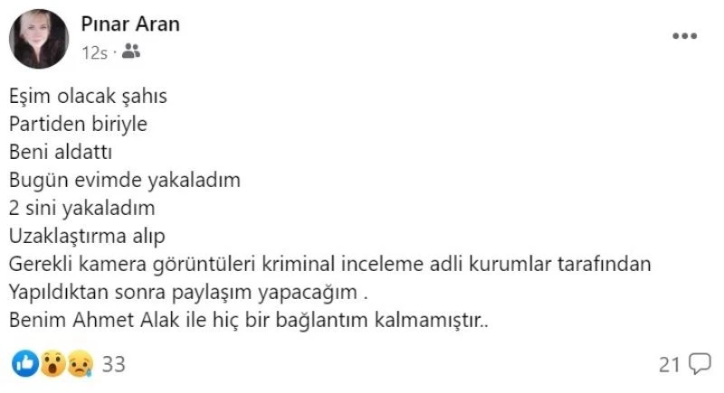 Aydın’ın İncirliova ilçesinde, İYİ Parti İlçe Başkanı Ahmet Alak’ın eşi Pınar Aran Alak sosyal medya paylaşımı ile partiyi sarsmıştı. Eşinin kendisini partili bir kadınla aldattığını ileri süren Pınar Aran Alak’ın sosyal medya paylaşımı üzerine Başkan Alak, İYİ Parti İncirliova ilçe başkanlığı görevinden, aldatıldığını ileri süren eşi Pınar Aran Alak ise parti üyeliğinden istifa etmişti. Pınar Aran Alak, olayın üstünden sekiz gün geçtikten sonra bu sefer, sosyal medya paylaşımında olayı yanlış anladığını söyledi.