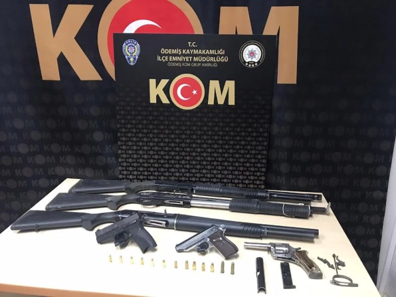 Ödemiş İlçe Emniyet Müdürlüğü Kaçakçılık ve Organize Suçlarla Mücadele Suçlarla Mücadele (KOM) Grup Amirliği ekipleri, şüphe üzerine ilçe merkezinde seyir halindeki bir aracı durdurdu. Ekipler tarafından yapılan kontrolde, S.Ç.’ye ait olduğu belirlenen araç içerisinden 3 adet ruhsatsız tüfek, 2 adet ruhsatsız tabanca, 9 adet fişek ve çeşitli silah aparatları bulundu. Araç içerisinde bulunan İ.E.’ye yapılan üst aramasında da 1 adet ruhsatsız tabanca ve 4 adet fişek ele geçirildi.