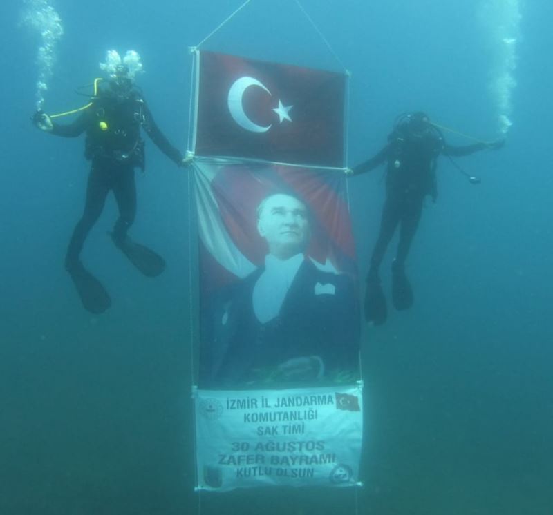 İzmir İl Jandarma Komutanlığı Sualtı Arama ve Kurtarma Timleri (SAK), Menderes ilçesi Özdere açıklarında 20 metrelik derinlikte büyük zaferin 98’inci yıl dönümü için kutlama etkinliği yaptı. Dalış yapan tim, denizde Türk bayrağı ve Atatürk posteri açtı. Ekipler ayrıca, 20 metrelik derinlikte asker selamı vererek 30 Ağustos Zafer Bayramını kutladı.