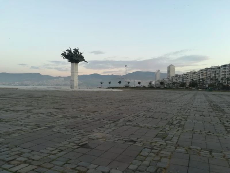 İçişleri Bakanlığı tarafından Covid-19 tedbirleri kapsamında tüm yurtta hafta sonunun tamamı için sokağa çıkma kısıtlaması ilan edildi. Cuma akşamı saat 21.00 itibari ile İzmir’de de uygulanmaya başlayan kısıtlama ile birlikte, kısıtlamadan muaf olacak iş alanlarında çalışanlar dışında tüm vatandaşlar evlerinde kalırken, kente sessizlik hakim oldu. Cumartesi sabahının ilk ışıklarıyla birlikte şehrin en işlek meydan, cadde ve bulvarları boş kaldı. Özellikle kentin simge noktalarında yaya yoğunluğunun olduğu Cumhuriyet Meydanı ve Gündoğdu Meydanı sessizliğe bürünürken, trafik yoğunluğunun fazla olduğu Mustafa Kemal Sahil Bulvarı ve Ankara Caddesi’nde ise az sayıda araç geçişinin olduğu gözlemlendi.