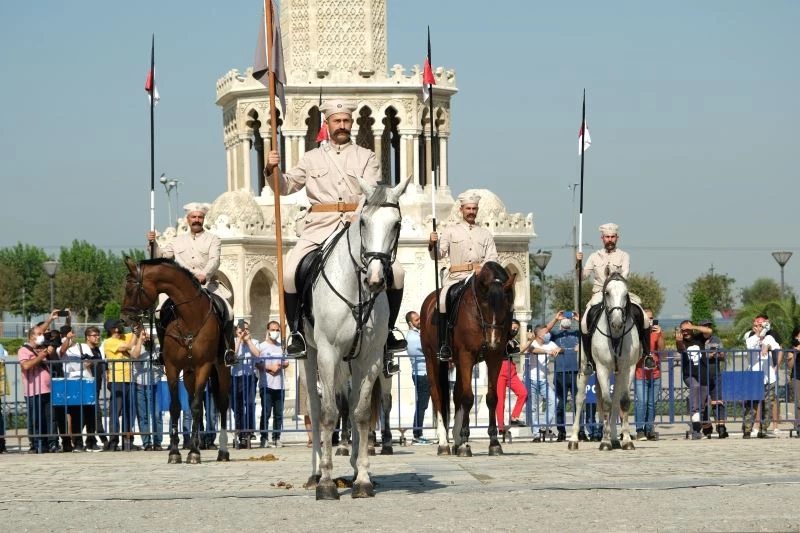 İzmir’in kurtuluşunun 99. yıldönümü etkinlikleri kapsamında süvari birlikleri, İzmir Valiliği önünde temsili olarak İzmir’in kurtuluşunu canlandırdı. Ardından Cumhuriyet Meydan’ında çeşitli gösterilerle 9 Eylül coşkusu devam etti.