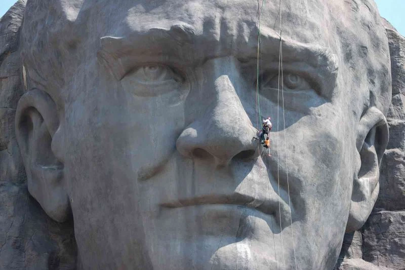 Buca Belediyesi, Türkiye’nin en büyük rölyef heykeli olan Atatürk maskını profesyonel dağcılardan oluşan bir ekiple bakıma aldı.