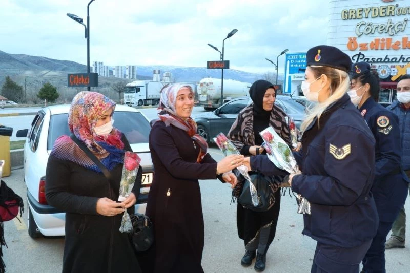 Kırıkkale’de görev yapan jandarma kadın astsubaylar, 8 Mart Kadınlar Günü dolayısıyla kadınlara karanfil verdi.