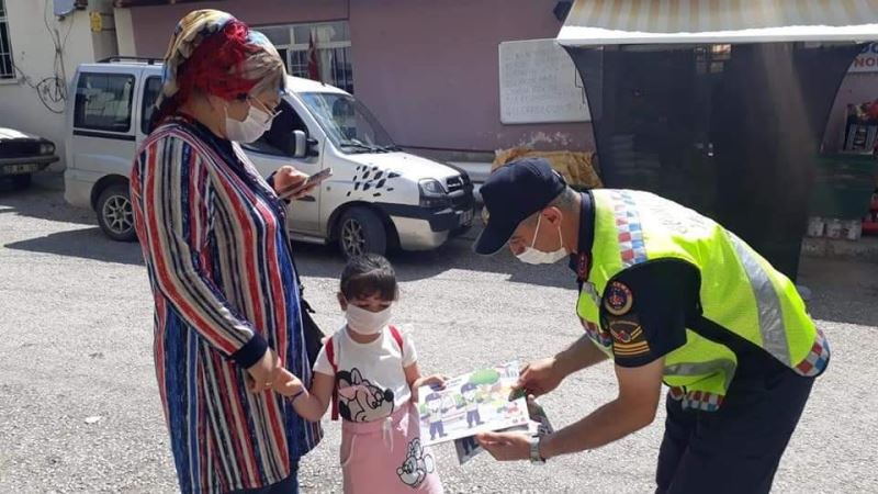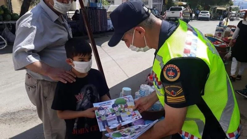 Denizli’de jandarma ekipleri, çocukların salgın sebebiyle evde kaldıkları sürede trafik kurallarını öğrenmelerini amaçlayarak boyama kitabı hediye etti.
