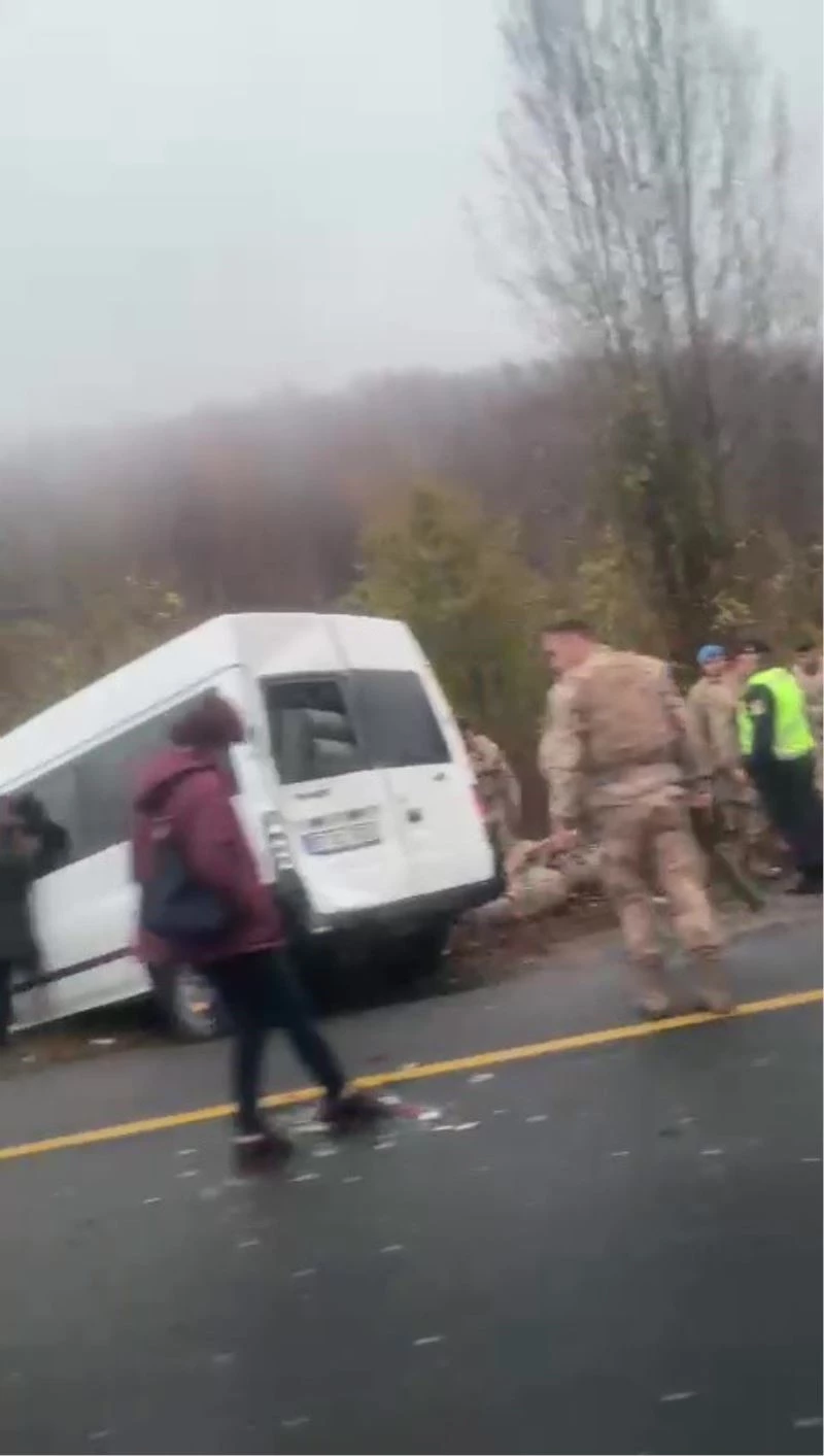 DÜZCE – Düzce’de meydana gelen deprem sonrası destek için kente gelen Jandarma ekiplerinin içinde bulunduğunu minibüs dönüş yolunda kaza yaptı. 6 kişi hafif yaralandı.