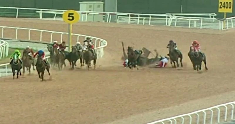 Adana’da yapılan at yarışı sırasında 3 at ve jokeyi zincirleme kaza sonucu kendilerini yerde buldu. Kazada dili boğazına kaçan ve ağzı kum dolan genç jokeyi, meslektaşı hayata döndürdü.
