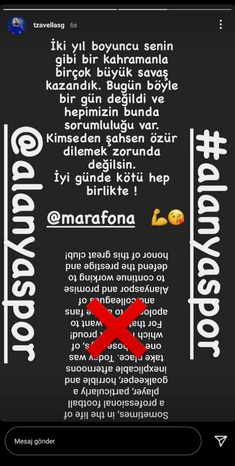 Kişisel sosyal medya hesabından yaptığı paylaşımda Marafona, "Bazen bir futbolcunun ve özellikle kalecinin korkunç ve anlaşılmaz maçları olur. Bu da benim gurur duymayacağım maçlardan biriydi. Alanyaspor taraftarlarından özür diliyorum. Bu harika kulübün prestiji ve onuru için çalışmaya devam edeceğime söz veriyorum" dedi.
