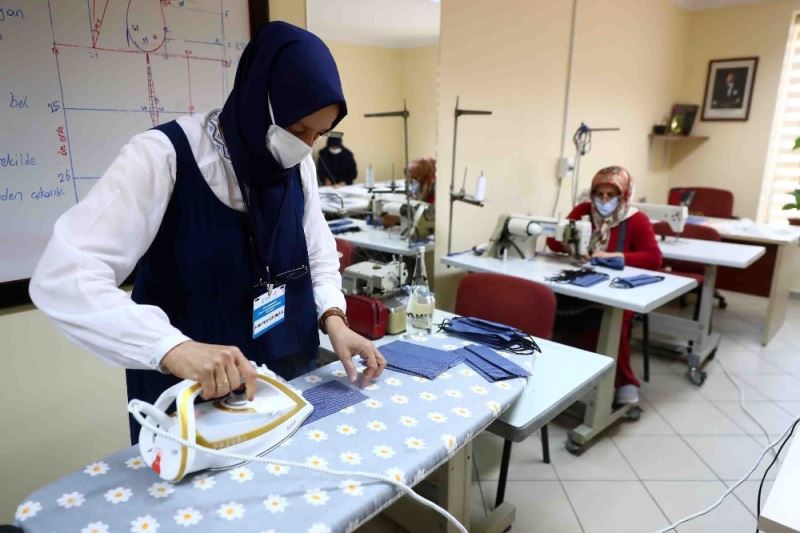 Bağcılar Belediyesi Kadın ve Aile Kültür Sanat Merkezi Giyim Üretimi Atölyesi’nde eğitim gören kursiyerler, pamuklu kumaştan maske üretimi yaparak ekonomik kazanç sağlıyor. Çoğunluğu ev hanımlarından oluşan kursiyerler, her zevke uygun istenilen ölçü, renk ve modelden maske siparişi de alıyorlar.