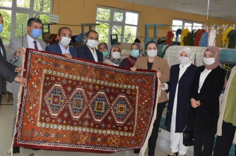 Kaymakam Demir, atölye ziyaretinde dokunan halılar ve atölyenin faaliyetleri hakkında, atölyelerin geliştirilmesi ve sürdürebilirliği konusunda bilgi aldı.