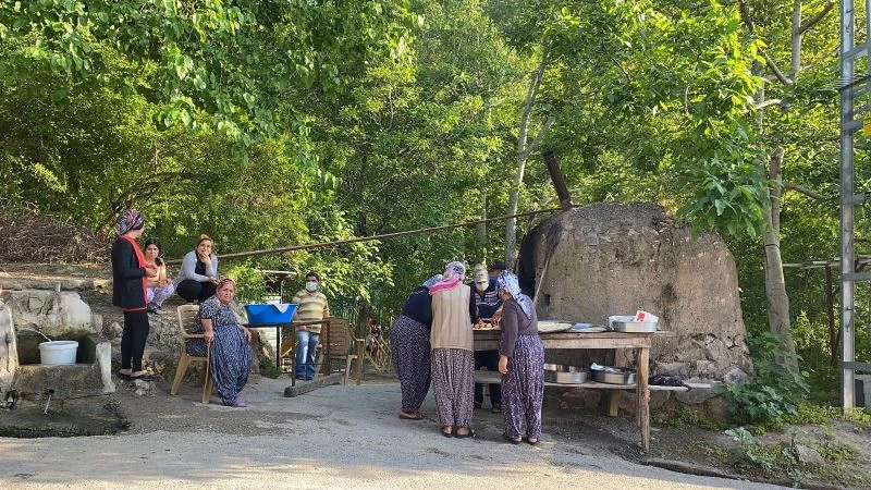 Hatay’ın İskenderun ilçesine bağlı Su Çıkağı köyünde ramazan bayramında kadınlar tarafından hazırlanan bayram kömbeleri erkekler tarafından tandırda pişiriliyor.