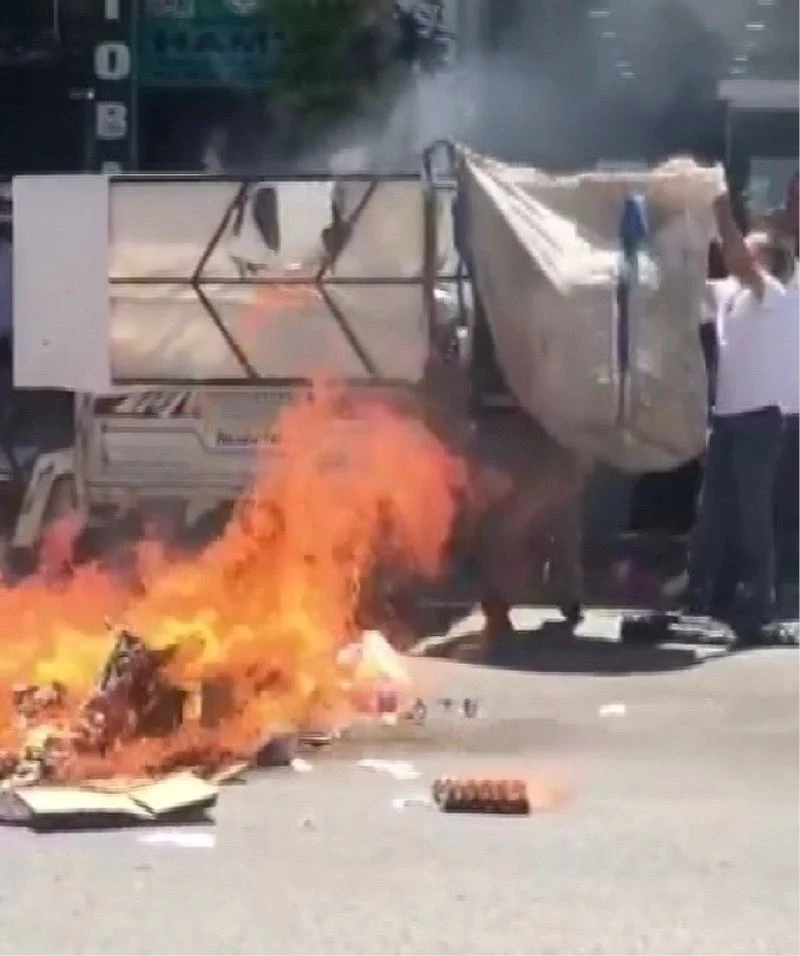 Adıyaman’da, seyir halinde olduğu esnada alev alan kağıt toplama aracındaki yangını söndürmek için vatandaşlar seferber oldu.