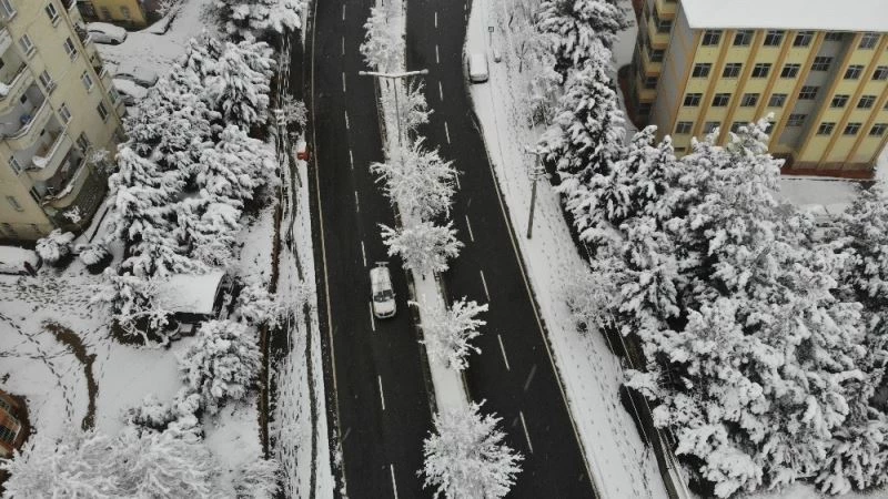 Kahramanmaraş’ta kar yağışı nedeniyle kent merkezi beyaz örtüye büründü.