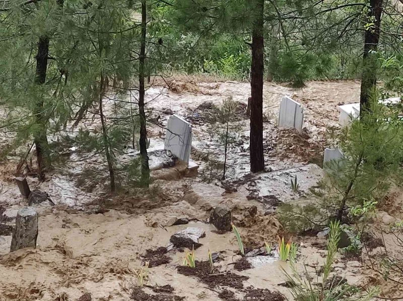 Yoldan aşan sel suları yol kenarında bulunan Ilıca Mezarlığı’na yönelerek mezarlara zarar verdi.