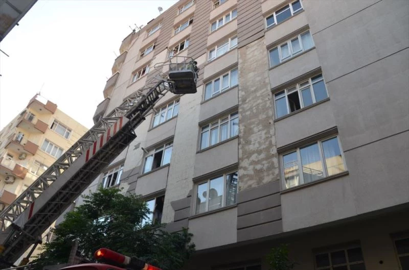 İtfaiye ekipleri, binadaki tehlike oluşturan dış cephe kaplamalarını merdivene çıkarak söktü.