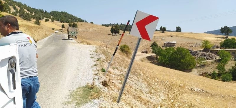 Kahramanmaraş Büyükşehir Belediyesi yol yapım ve onarım çalışmaları kapsamında il genelinde mevcut yollarda bulunan trafik levhalarının bakım ve onarımlarını gerçekleştiriyor.