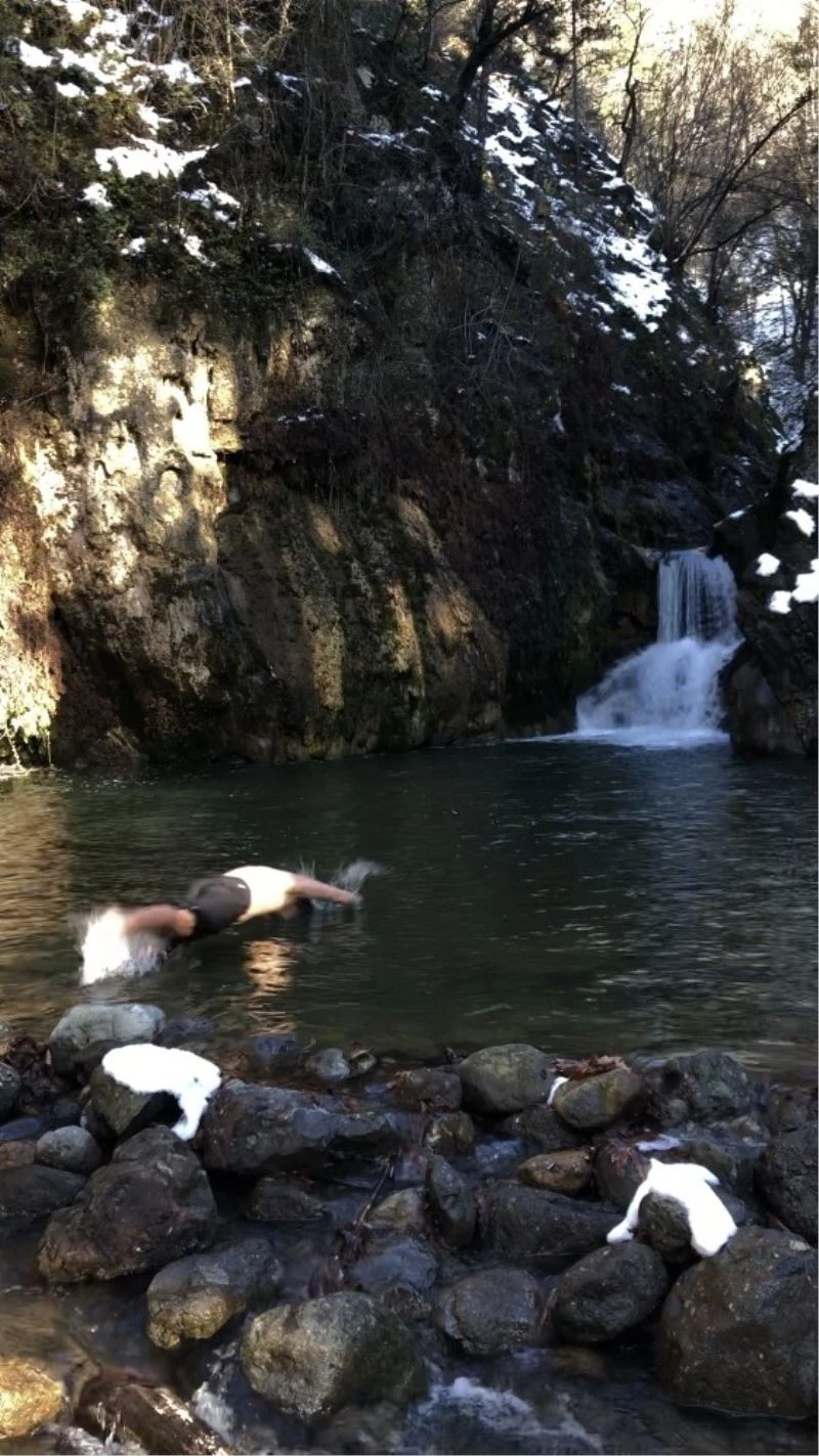 Yenice ilçesine bağlı Kızılkaya bölgesinde kamp kuran İbrahim Yücel isimli genç, sıfırın altında eksi 10 derece sıcaklığı bulunan buz gibi suya atlayarak yüzdü. Şelalenin yanına kurduğu masada oturan genç kahvesini yudumladıktan sonra üzerindeki bornozunu çıkararak kendini buz gibi su atarak yüzdü. O anları ise yanındaki arkadaşı videoya çekerek kayda aldı.