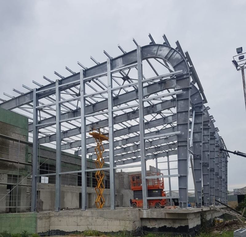 Kocaeli Büyükşehir Belediyesi’nin Kandıra’da inşa ettiği yarı olimpik yüzme havuzunun çelik montajı yapılıyor.