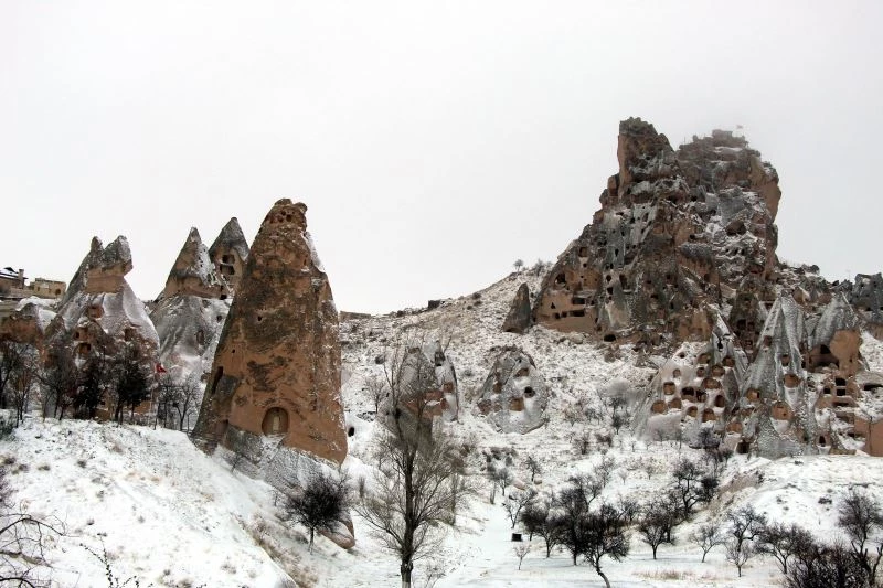 Kapadokya’da Nisan ayında peribacaları beyaza büründü