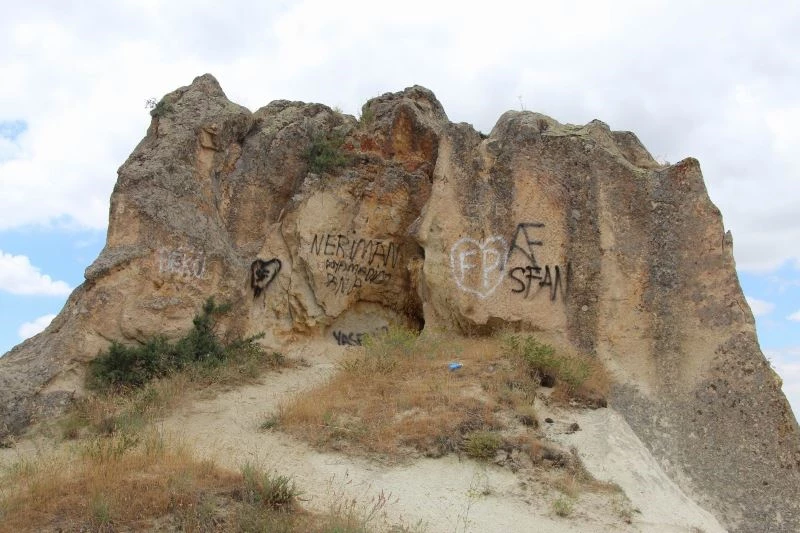 Türkiye’nin önemli turizm merkezlerinden Kapadokya bölgesinde bulunan peribacalarına sprey boyalarla isimleri yazan kişi veya kişiler turistlerin büyük tepkisini çekti.