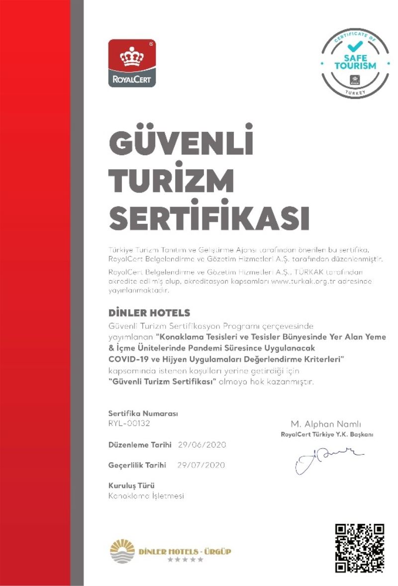 Ürgüp’te 1989’dan bu yana yerli ve yabancı turistleri ağırlayarak bölgenin ekonomisine katkı sağlayan Dinler Hotels - Ürgüp, Kültür ve Turizm Bakanlığı öncülüğünde Sağlık, Ulaştırma ve Altyapı, İçişleri ile Dışişleri bakanlıklarının katkıları ve Türkiye Otelciler Federasyonu (TÜROFED) ile tüm sektör paydaşlarının işbirliğiyle başlatılan Sağlıklı Turizm Belgelendirme Programı kapsamında Kapadokya Bölgesinde "Güvenli Turizm Sertifikası" alan ilk 5 yıldızlı oteli oldu.