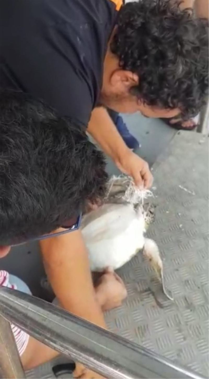 Hatay’da bir gezi firmasının tekne kaptanı Kerem Dobriç, gezi teknesini durdurarak boynuna çuval dolanan bir caretta carettanın hayatını kurtardı.