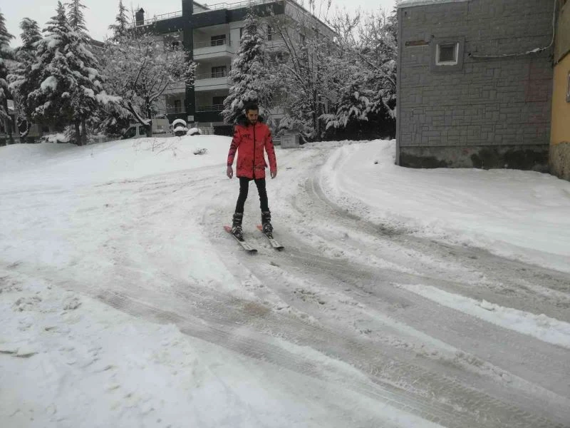 Kar Elazığ’ı kapladı, 3 kafadar kayak takımlarını alıp caddeleri kayakla gezdi