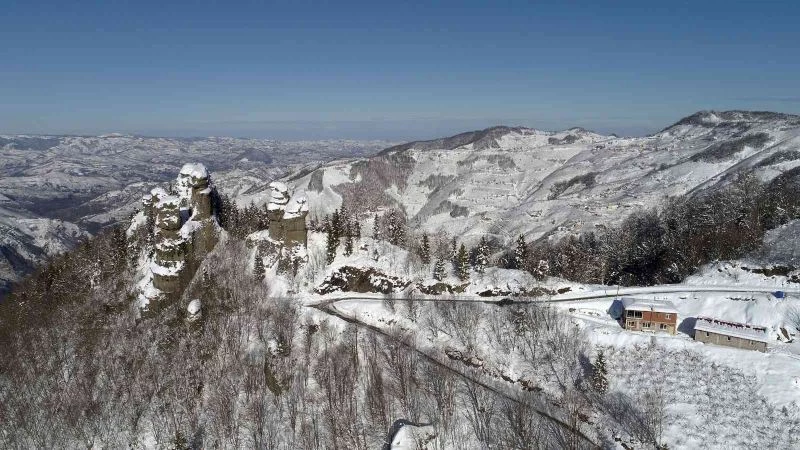 Ordu’nun peribacaları olarak anılan kayalıklar karla ayrı bir güzelliğe büründü.