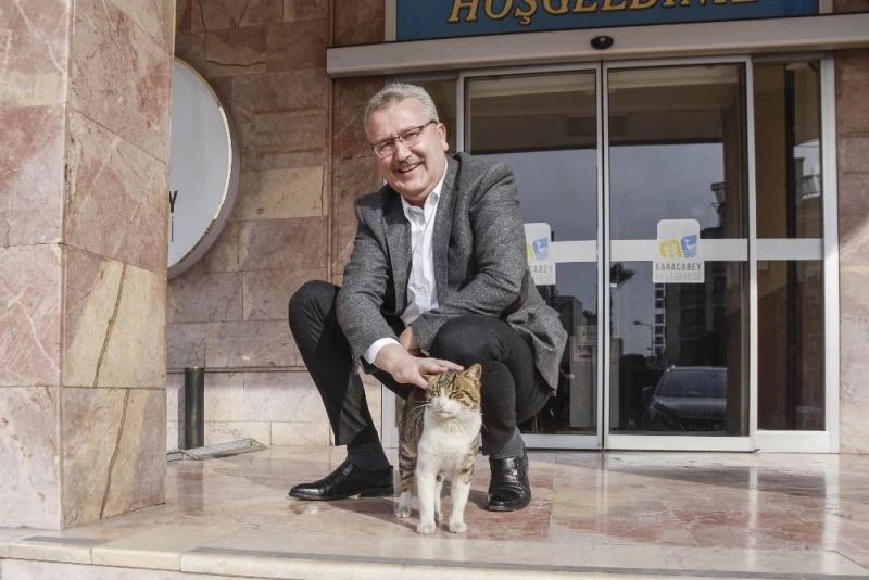 Karacabey Belediye binası girişinde denk geldiği kedi ve köpekleri sevmeden geçmeyen Ali Özkan da sokak hayvanları için kapıya yem ve su koydurmayı ihmal etmiyor.