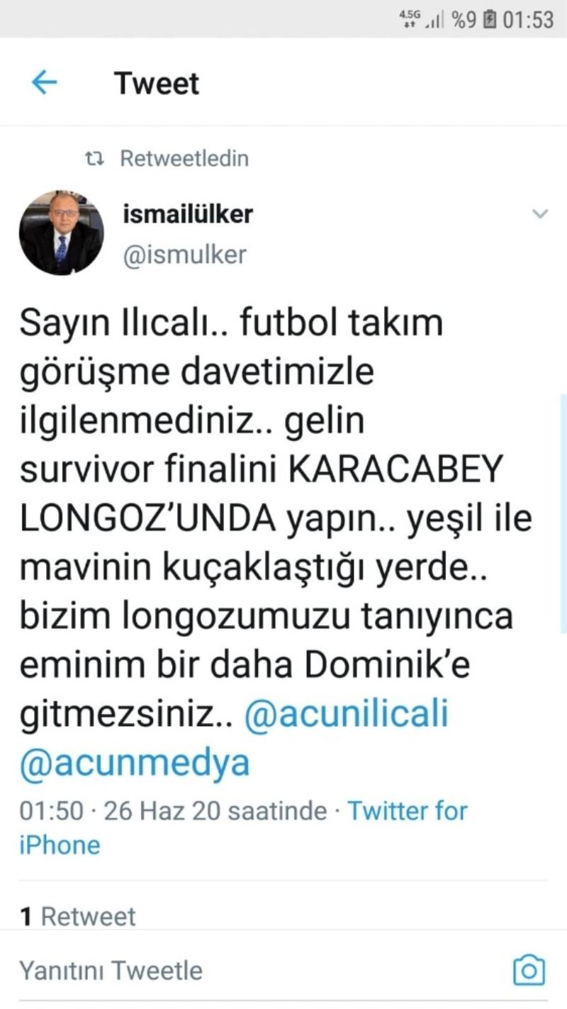 Teklifle ilgilenmeyen Acun Ilıcalı’ya Karacabey Belediyespor Başkanı İsmail Ülker yeni bir tweet atarak, yeni bir teklifte bulundu. Başkan Ülker, “Sayın Ilıcalı. Futbol takımı görüşme davetimizle ilgilenmediniz. Gelin Survivor finalini Karacabey Longozunda yapın. Yeşil ile mavinin kucaklaştığı yerde. Bizim longozumuzu tanıyınca eminim bir daha Dominik’e gitmezsiniz” şeklinde ifadeler kullandı.
