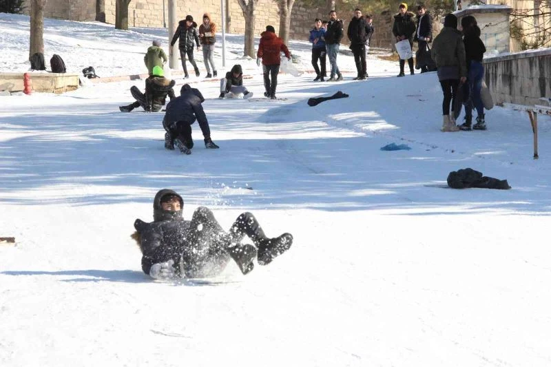 Karaman’da yağan karın ardından Karaman Kalesi’ne akın eden çocuklar, sini, naylon ve kızaklarla kayarak eğlendi.