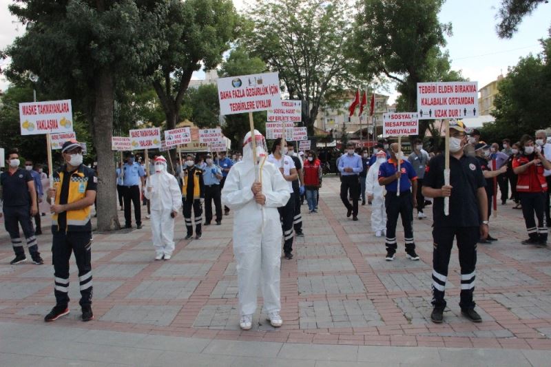 Karaman’da İl Sağlık Müdürlüğü tarafından Covid-19 ile mücadele ve sürecinde farkındalık oluşturmak amacıyla ‘Pandemi Farkındalık Yürüyüşü’ düzenlendi. Sosyal mesafe korunarak yapılan yürüyüşe Karaman Valisi Mehmet Alpaslan Işık, Emniyet Müdürü Ayhan Taş, İl Jandarma Komutanı Albay İsmail Şahin, İl Sağlık Müdürü Adnan Kurşun, daire müdürleri ve siyasi parti temsilcileri ile sivil toplum kuruluşlarının temsilcileri de katıldı. Cumhuriyet Parkı’nda başlayan yürüyüş İsmet Paşa Caddesi üzerinden devam ederek Aktekke 15 Temmuz Demokrasi Meydanı’nda sona erdi. Polis, jandarma, AFAD, sağlık ve vefa grubu görevlileri ellerinde ’Daha fazla özgürlük için tedbirlere uyalım’, ’’Mesafe kurallarına uyalım’ ve ’Kontrollü sosyal hayata hep birlikte tedbir’ dövizleri taşıyarak yürüdü. Yürüyüşe jandarma, polis ve AFAD araçları siren çalarak eşlik etti.