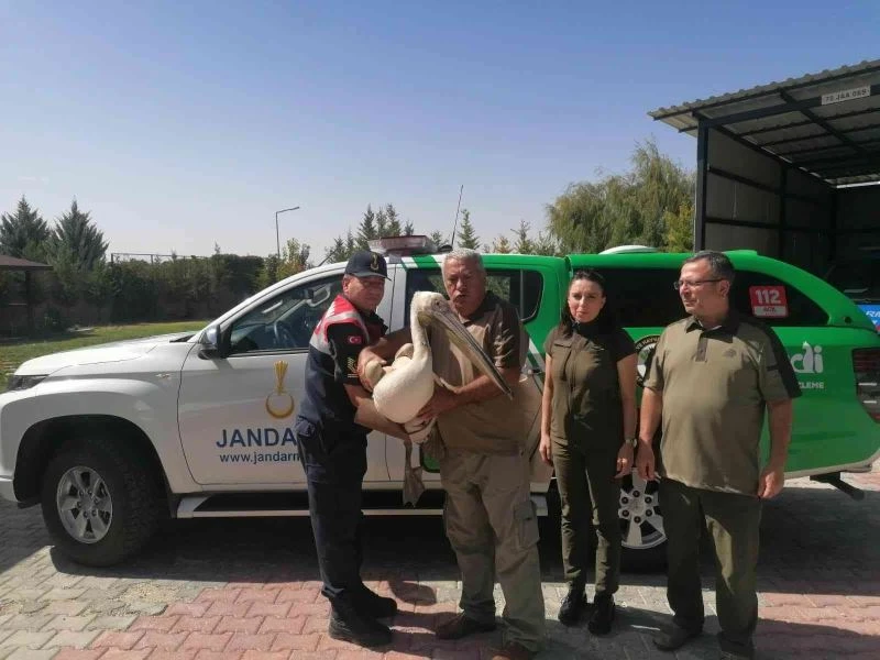 Karaman’da vatandaşlar tarafından bulunduktan sonra jandarmaya teslim edilen yaralı Pelikan kuşu, tedavisinin yapılması için koruma altına alındı.