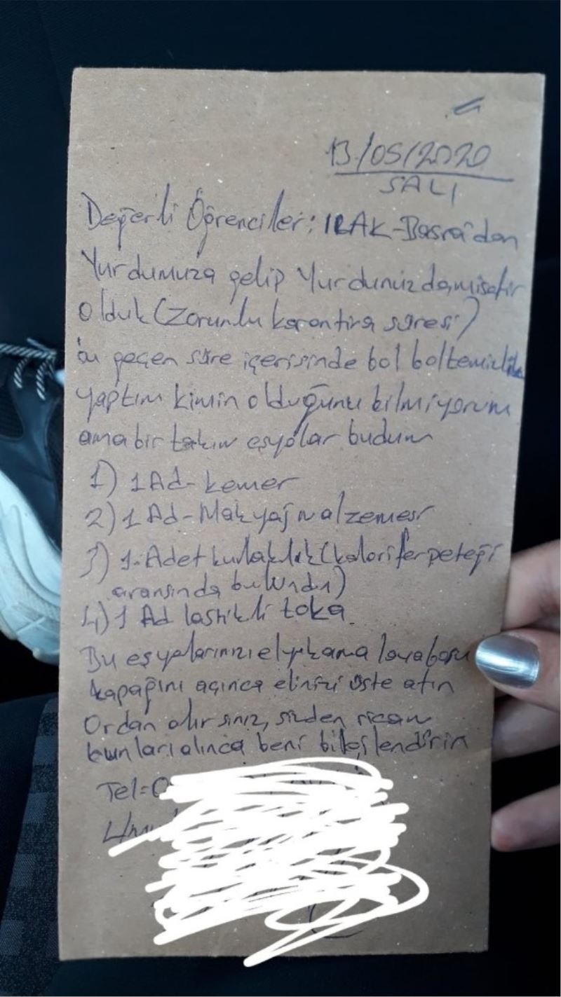 Korona virüs (Covid-19) salgını sürecinde geçtiğimiz ay Kredi ve Yurtlar Kurumu (KYK)’ya ait Bacım Sultan Kız Öğrenci Yurdunda, yurtdışından gelen vatandaşlar 14 günlük karantina süreci boyunca misafir edilmişti. Irak’ın Basra kentinden uçakla getirilerek Afyonkarahisar’daki kız öğrenci yurdunda 14 gün karantinada bulunan bir vatandaşta kaldığı odada daha önce yaşayan kız öğrenciye mektup ile bir miktar para bıraktığı ortaya çıktı. Şehirlerarası seyahat kısıtlamısının kaldırılmasının ardından odasındaki eşyalarını toplamak üzere gelen kız öğrenci, odasında “Bir miktar para bıraktım, iyi günlerde harcayın. Başarılar” yazılı bir zarf ile karşılaştı. Zarfın içerisinden ayrıca birde odada kız öğrenciye ait kişisel eşyaları nereye koyduğuna dairde bir bilgilendirme notu çıktı.