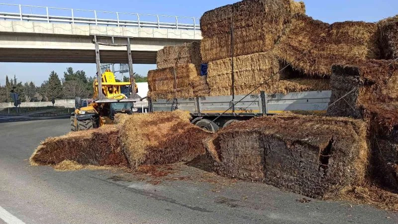 Kamyonla birlikte yolda kalan balyalar daha sonra bir yükleme aracı ile yol kenarına kaldırılırken, bölgeye gelen polis ekipleri de yol temizlenene kadar trafiğin güvenli bir şekilde akışını sağladı.
