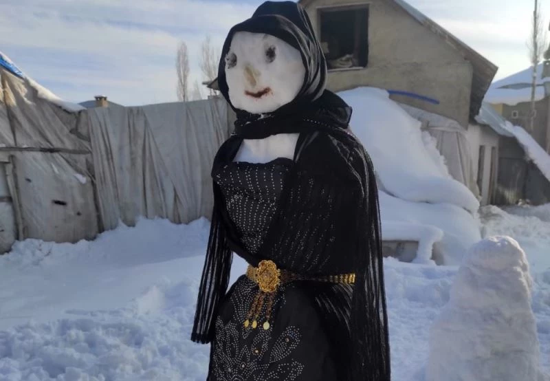 Hakkâri’nin Yüksekova ilçesinde vatandaşlar yaptıkları kardan kadına yöresel elbise olan fistan giydirdiler.