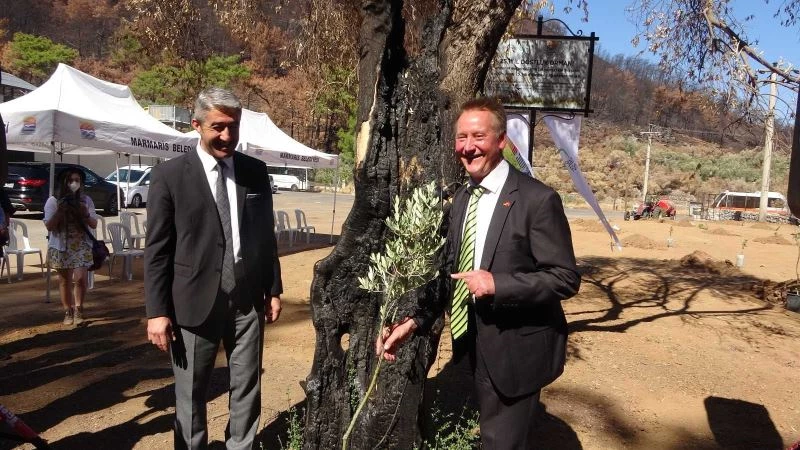 Marmaris Belediye Başkanı Mehmet Oktay ve Fürth Belediye Başkanı Thomas Jung birlikte yanmış bir zeytin ağacının kalan gövdesinin gölgesine yine bir zeytin ağacı diktiler. Ağacı dikerken bu dostluğumuz adına çok bir sembol şeklinde konuştu.