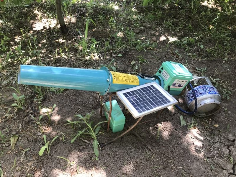 Iğdır’a bağlı Yaycı köyünde 12 dönüm arazi üzerinde kiraz bahçesi bulunan Caner Akkoç isimli çiftçi, “Ben o zaman bu ürünü kuş kovucu diye aldım. Bu ürünü 2018 yılından beridir kullanıyorum. Biz bu yörede bu düzeneğe Karga savar diyoruz. Bu bölgede bulunan Karga ve Saksağan gibi kuşları bu ürün yardımıyla kovuyoruz. Özellikle erkenci ürün dediğimiz çeşitlilik döneminde kuşlar bize çok zarar veriyordu. Ben bütün ürün çeşitleri ve dönemlerde kullanıyorum. Küçük tüple çalışıyor ve ayarlı olduğu için istediğimiz zamana göre ayarlayabiliyoruz. Şuan 2 dakikaya ayarlı olduğu için 2 dakikada bir patlatıyor. Sadece kuşlar değil yabani bütün hayvanları bahçeden uzak tutuyor” dedi.
