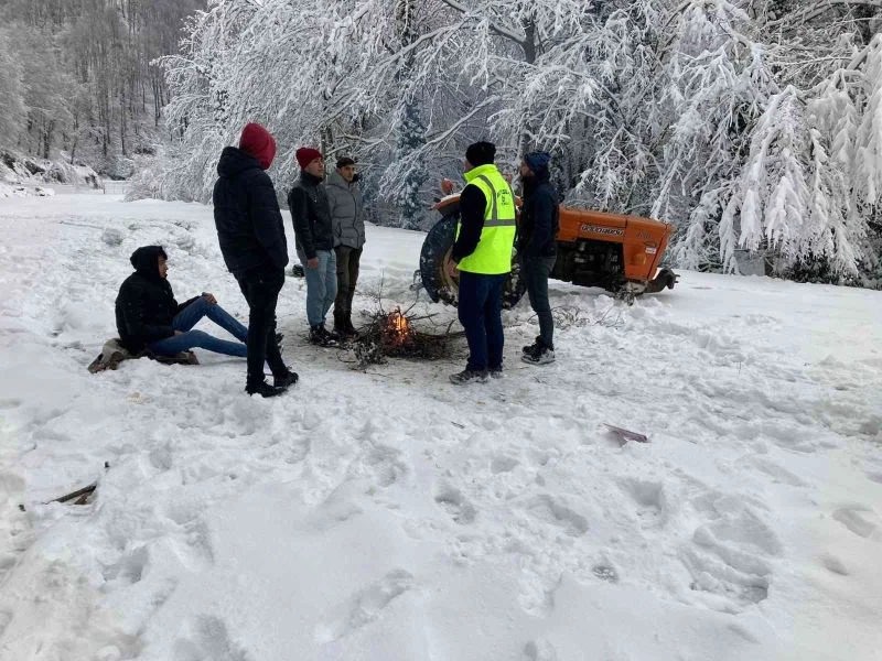 KOCAELİ – Karamürsel’de karla kaplı orman yolunda traktör ile gezintiye çıkan 3 genç yolda mahsur kaldı.