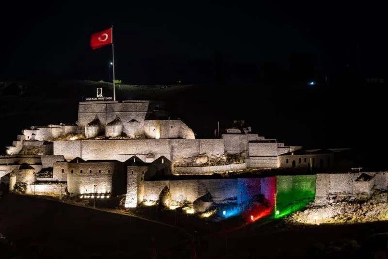 Kars’ın önemli tarihi yerlerinden birisi olan Kars Kalesi Azerbaycan bayrağının renkleriyle ışıklandırıldı.