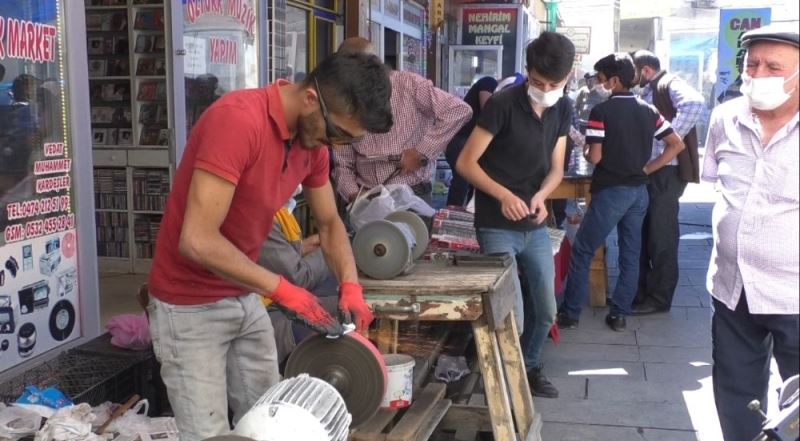 Korona virüs (Kovid-19) tedbirleri kapsamında sosyal mesafe kuralları çerçevesinde vatandaşlar bıçak, balta ve satırlarını biletiyor.