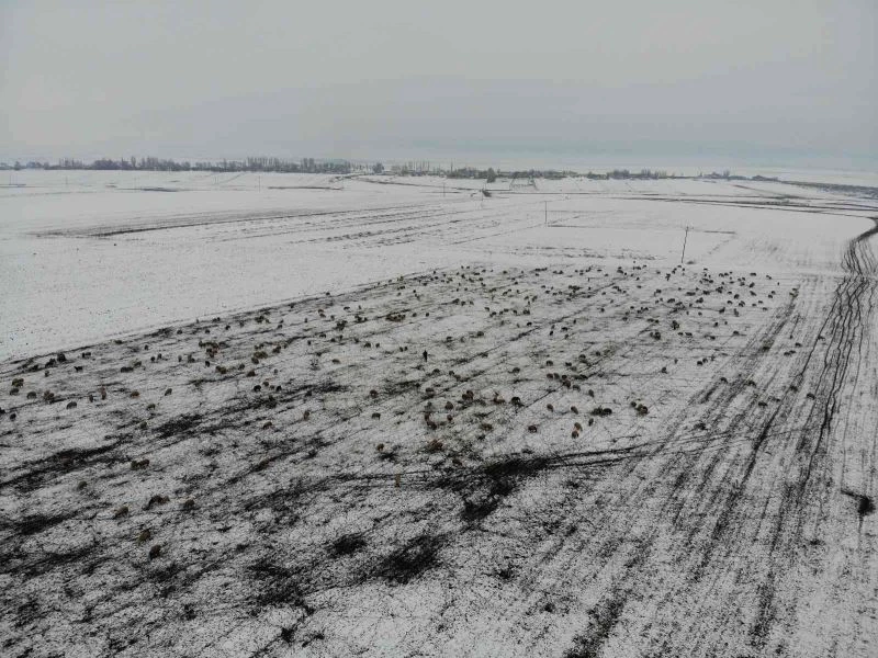 Kars’ta hayvanlarıyla yaylada kalmayı sürdüren son göçerler de kar yağışıyla birlikte göçe başladı. Göçerlerin kar üzerinde yolculuğu havadan görüntülendi.