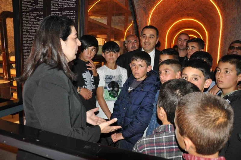 Kars’ta köy ilkokulu öğrencileri Peynir Müzesi’ni gezdi. Öğrenciler, sütün peynire dönüşmesini görerek öğrendiler.